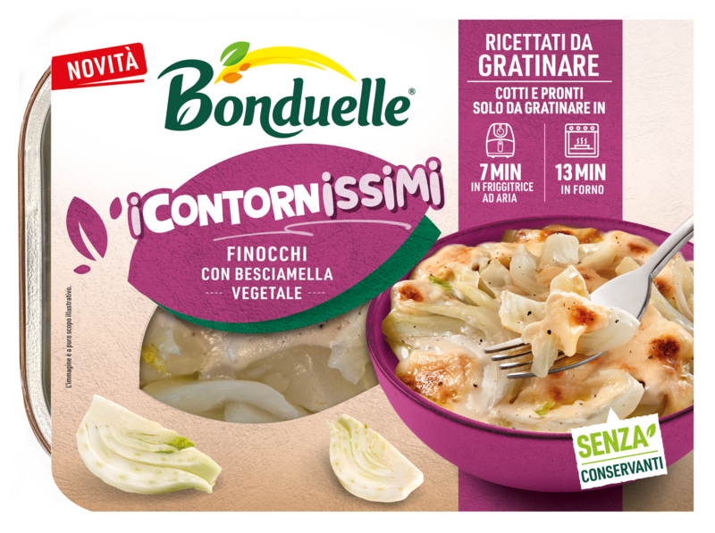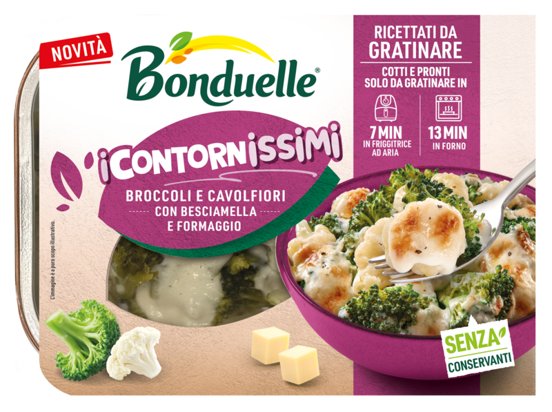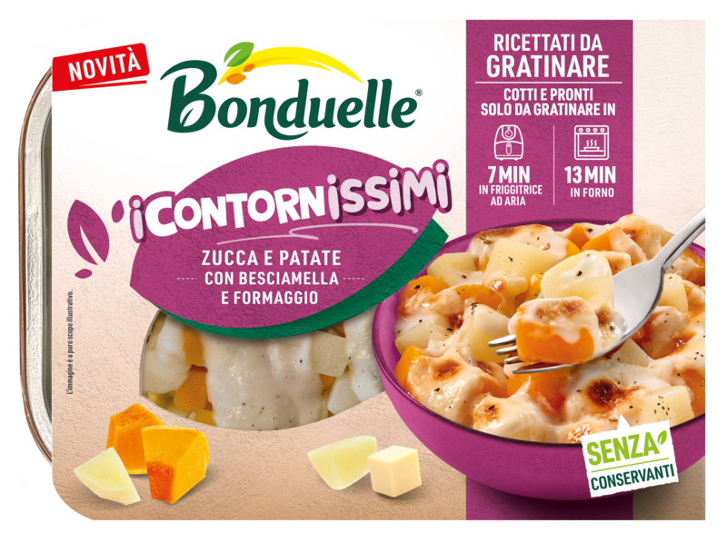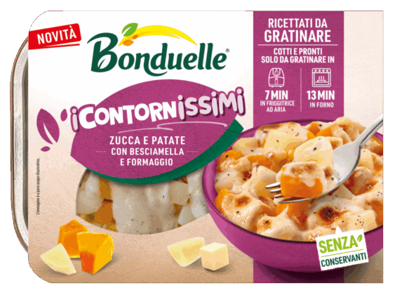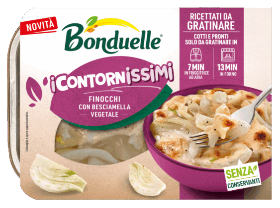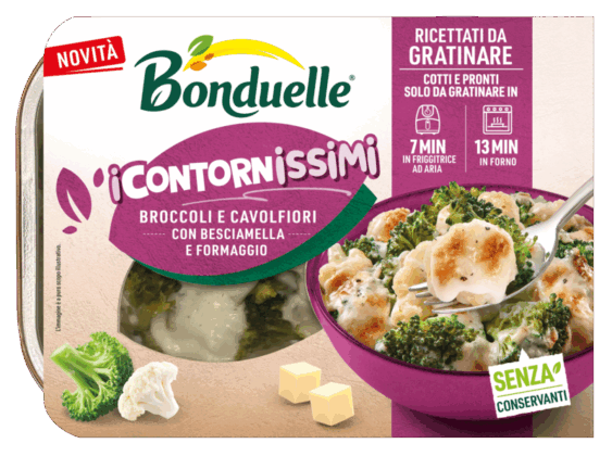 Verdure cotte con besciamella cremosa da gratinare in forno o friggitrice ad aria per un’esperienza golosa. La linea semplifica la preparazione di mix di verdure dalla lavorazione complessa: broccoli e cavolfiori con besciamella e formaggio, zucca e patate con besciamella e formaggio, finocchi con besciamella vegetale. Tempo di preparazione: 7 minuti in friggitrice ad aria o 13 minuti in forno.